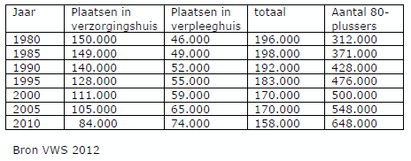 In 1980 woonde 48% van de 80-plussers in verzorgingshuizen, in 2010 nog maar 13%. Weliswaar nam het aantal mensen in verpleeghuizen toe, maar in relatieve zin is ook het gecombineerde aantal sterk afgenomen — in 1980 woonde nog 63% in verzorgings- of verpleeghuizen, in 2010 nog maar 24%.